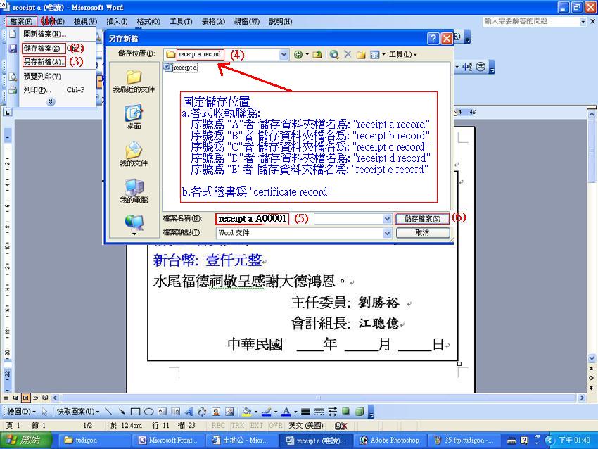 玖-參. (儲存及轉存) 七.浮標指向: (1).將浮標指向畫面右上角 "檔案"(1)則會出現畫面. (2).將浮標指向畫面右上角 "儲存檔案"(2) (3).將浮標指向畫面右上角 "另存新檔"(3)則會出現"列印"詢問框畫面. 將浮標指向詢問框 "儲存位置"(4). (固定儲存位置: a.各式收執聯為: 序號為 "A"者 儲存資料夾檔名為: "receipt a record" 序號為 "B"者 儲存資料夾檔名為: "receipt b record" 序號為 "C"者 儲存資料夾檔名為: "receipt c record" 序號為 "D"者 儲存資料夾檔名為: "receipt d record" 序號為 "E"者 儲存資料夾檔名為: "receipt e record" b.各式證書為 "certificate record" ) 將浮標指向詢問框 "檔案名稱"(5)處打"收執聯類別+序號: " (4).將浮標指向畫面詢問框 "儲存檔案"(6), 則會出現畫面. |